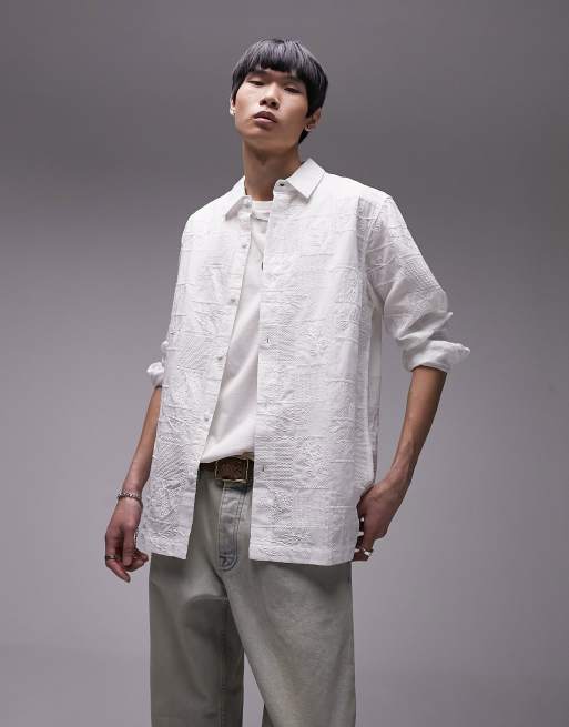 Topman long sleeve regular fit embroidered shirt in white