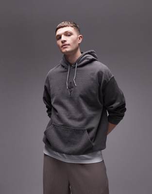 Topman oversized fit hoodie with dagger tattoo embroidery in washed black