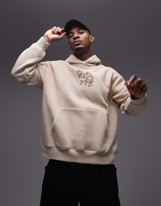 Topman oversized fit hoodie with front and back roses embroidery in stone