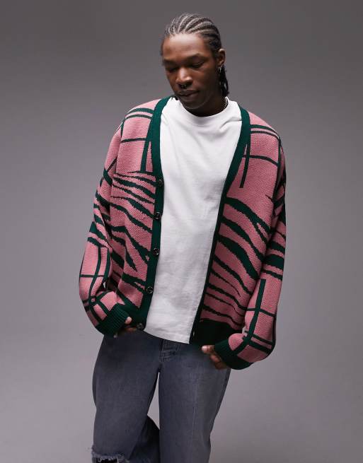 Topman oversized knitted cardigan with splice animal check in pink