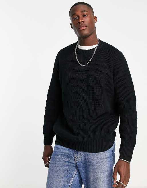 Topman oversized knitted fisherman jumper in black