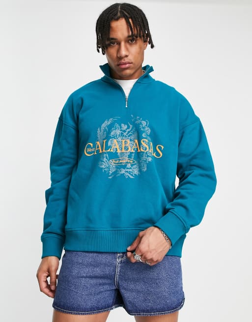 Topman oversized quarter zip sweatshirt with Calabasas print in green