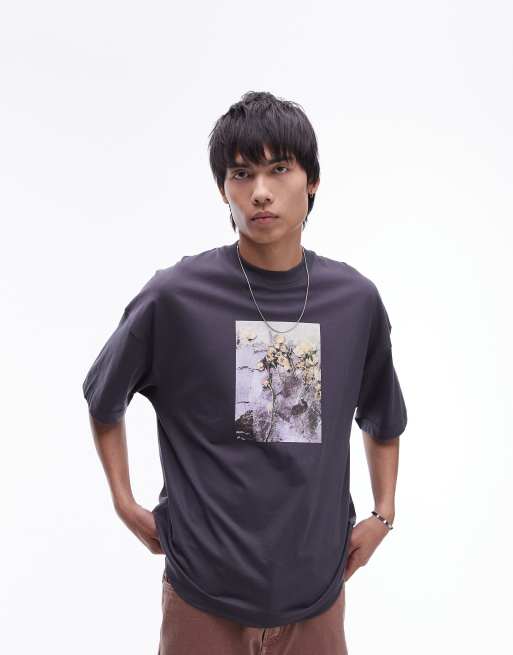 Topman premium extreme oversized fit t-shirt with frozen floral print in charcoal