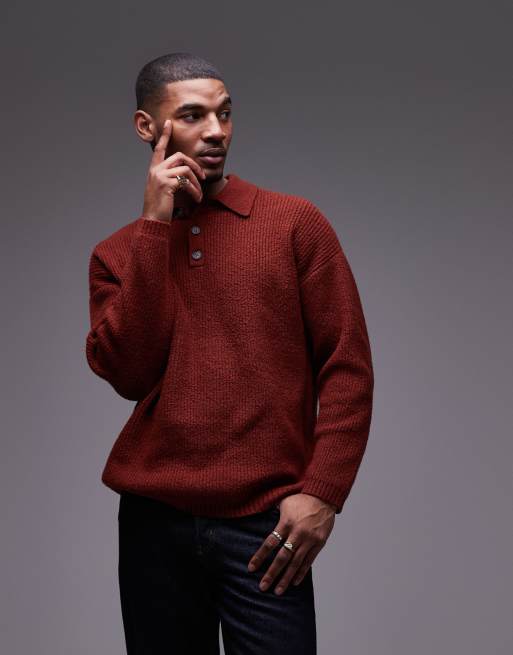 Topman relaxed fit compact knit polo jumper in dark red