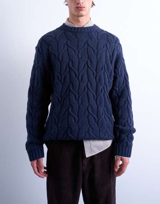 Topman relaxed fit heavyweight knitted jumper with cable in navy