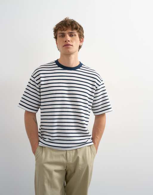 Topman relaxed fit textured t-shirt with breton stripe in navy.