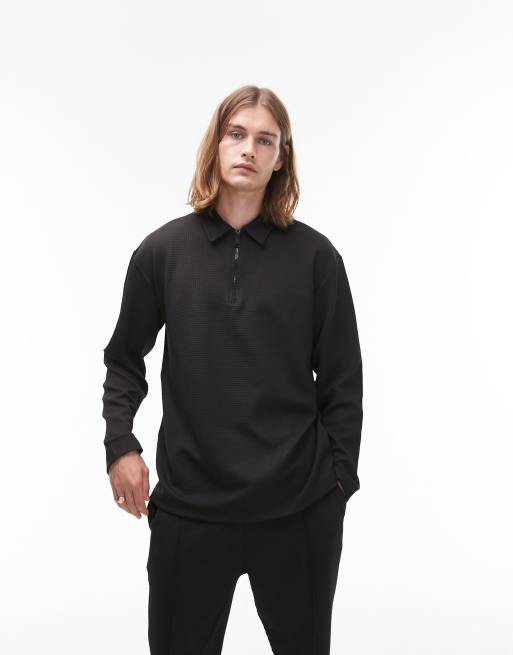 Topman relaxed fit waffle zip polo in black