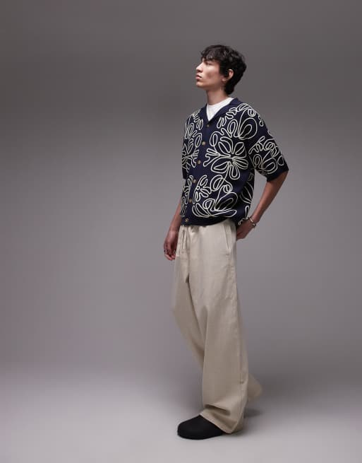 Topman relaxed heavy embroidered floral shirt in navy & cream