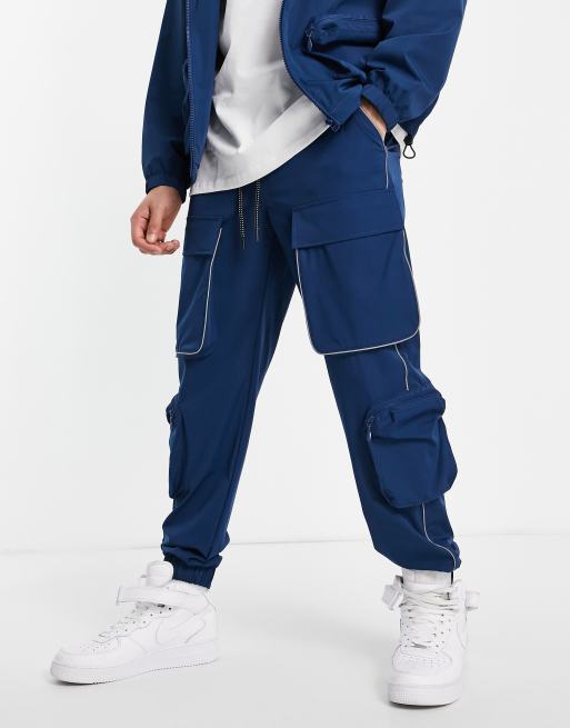 Topman relaxed nylon four pocket co-ord cargo trousers in blue