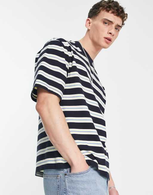 Topman relaxed t-shirt with multi stripe in navy and yellow