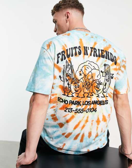 Topman relaxed tie dye tee with front and back fruit and friends print in multi