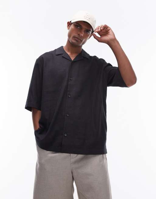 Topman short sleeve boxy linen mix shirt in black