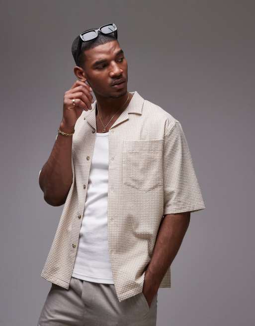 Topman short sleeve gingham seersucker shirt in ecru