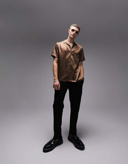 Topman short sleeve regular fit revere plain satin shirt in brown