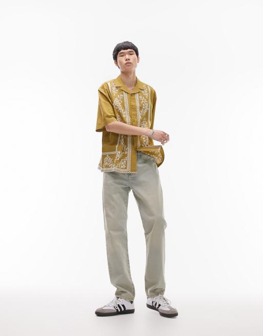Topman short sleeve relaxed fit revere boarded embroidered shirt in yellow