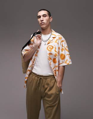 Topman short sleeve relaxed revere handdrawn abstract shirt in ecru and orange