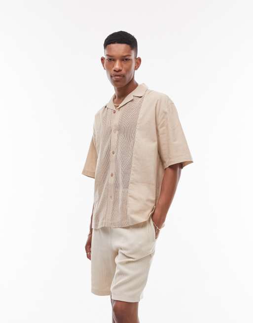 Topman short sleeve relaxed revere woven panel shirt in stone