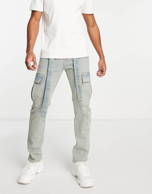 Topman straight belted cargo jeans in dirty light wash tint