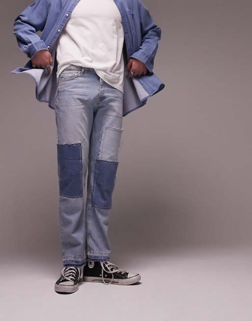 Topman straight patchwork jeans in mid wash blue