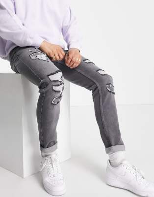 Topman stretch skinny jeans with rip and repair in grey