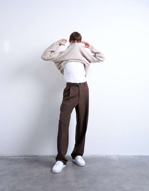 Topman wide leg belted twill smart trousers in chocolate