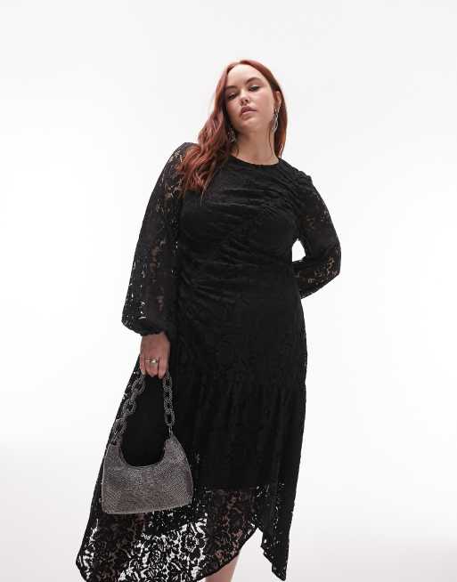 Topshop Curve ruched lace long sleeve midi dress in black