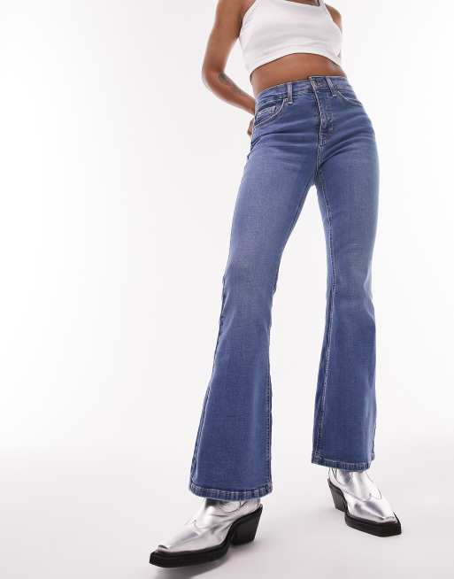 Topshop Petite high rise Jamie flare jeans in mid blue