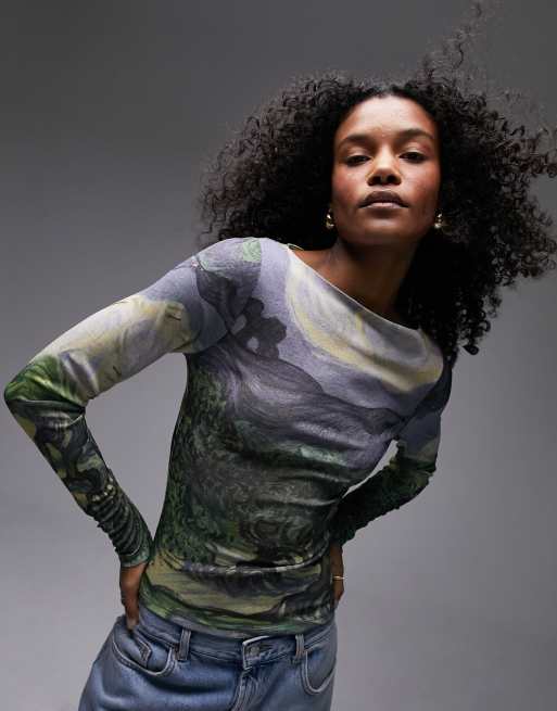 Topshop Art Museum Van Gogh mesh landscape slash long sleeve top in multi