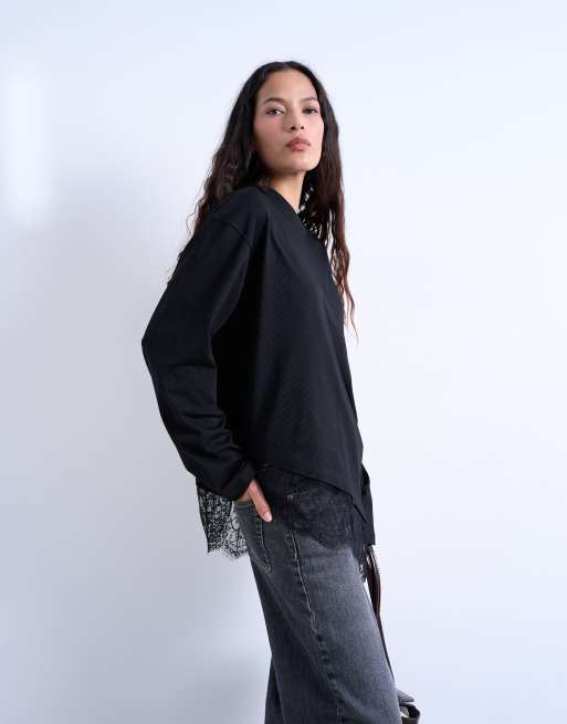 Topshop asymmetric lace trim oversized skater tee in black