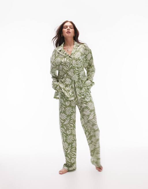 Topshop block floral print shirt and trouser pyjama set in green