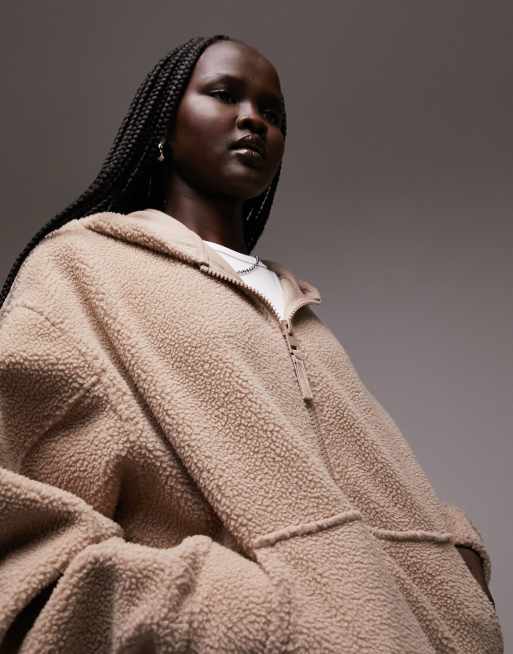 Topshop borg zip through fleece hoodie in neutral
