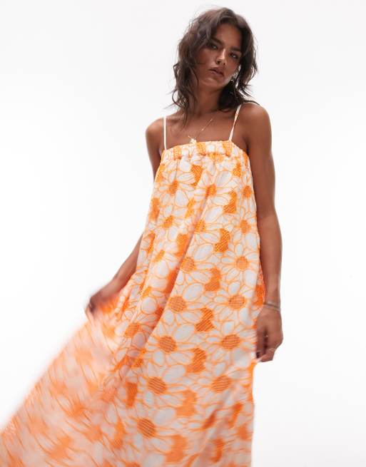 Topshop broderie strappy chuck on midi dress in orange floral