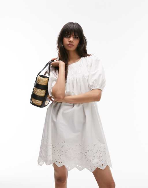 Topshop channelled mini oversized dress with broderie trim in white