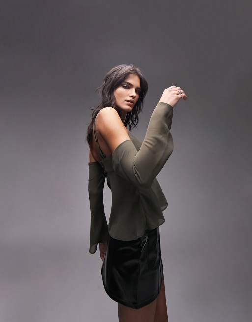 Topshop cold shoulder strappy long sleeve top in khaki