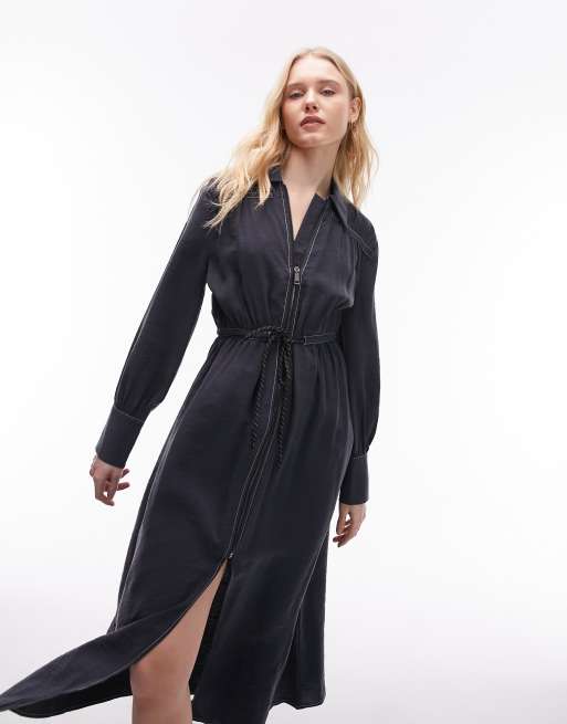 Topshop contrast stitch midi shirt dress with zip front in washed black
