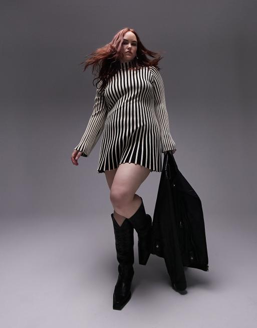 Topshop Curve knitted stripe long sleeve mini dress in monochrome