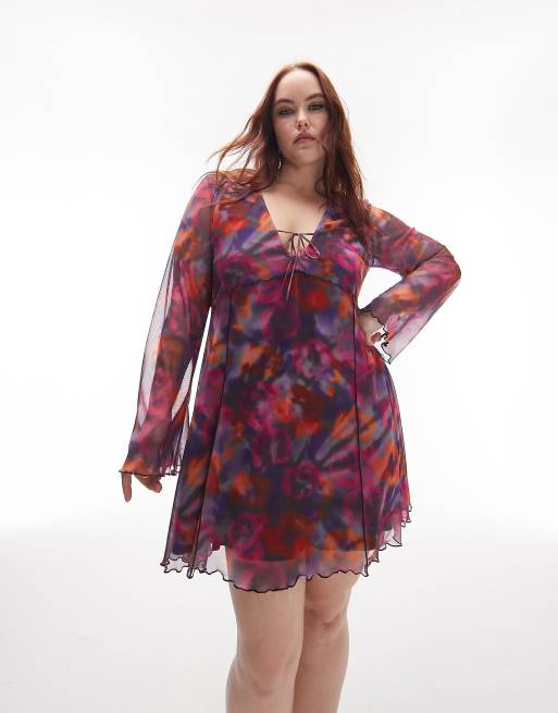 Topshop Curve lettuce edge mesh mini tea dress in pink rose