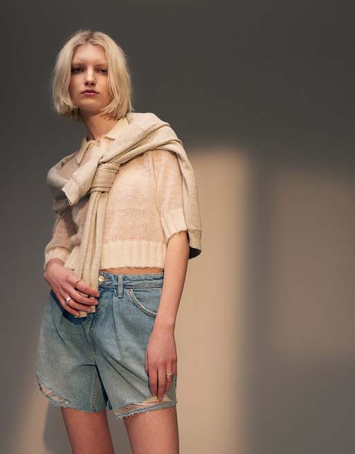 Topshop denim pleated shorts in bleach