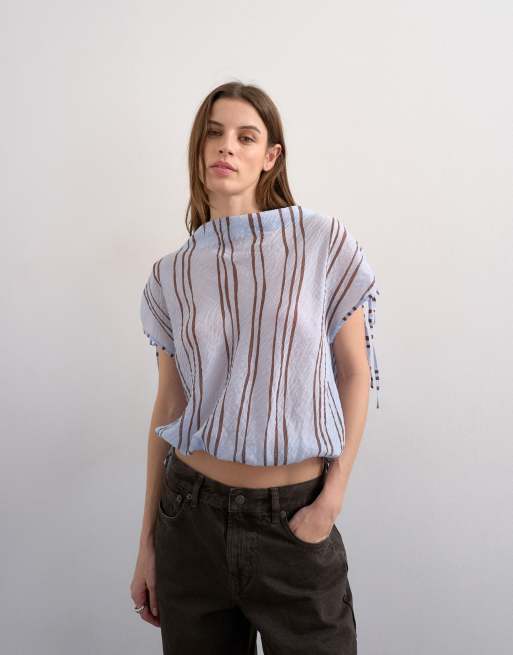 Topshop draped high neck top with tie in blue stripe