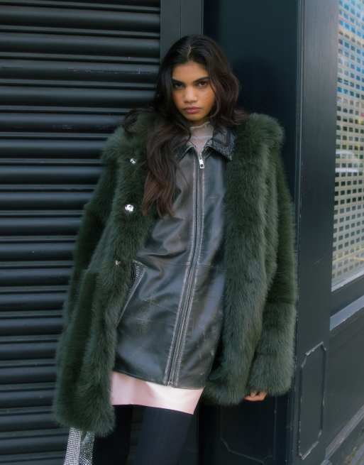 Topshop faux fur funnel midi coat in green