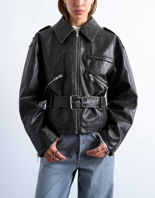Topshop faux leather low belted biker jacket in washed black