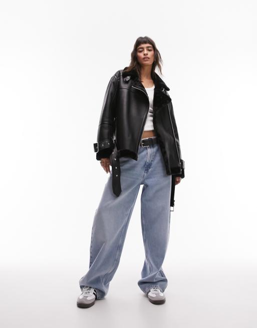 Topshop faux leather shearling oversized aviator biker jacket in black