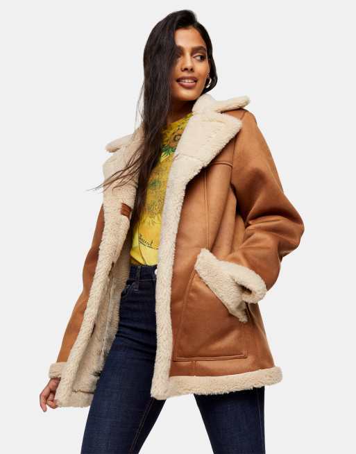 Topshop faux shearling car jacket in tan