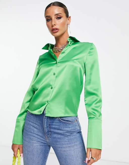 Topshop fitted long sleeve deep cuff satin shirt in green