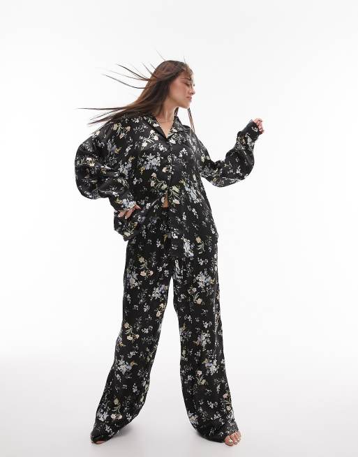 Topshop floral print satin piped shirt and trouser pyjama set in black