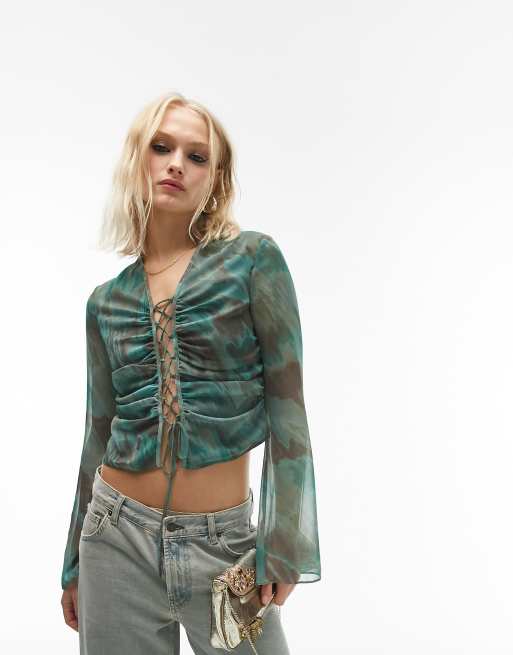 Topshop flute sleeve tie up chiffon top in multi