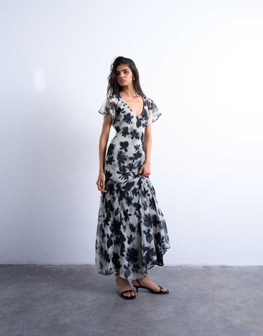 Topshop flutter sleeve godet hem midi dress in mono print