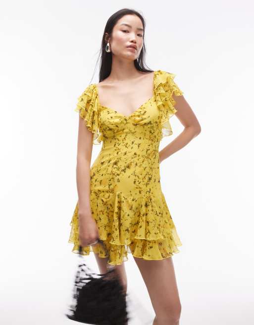 Topshop flutter sleeve mini tea dress in bright yellow print