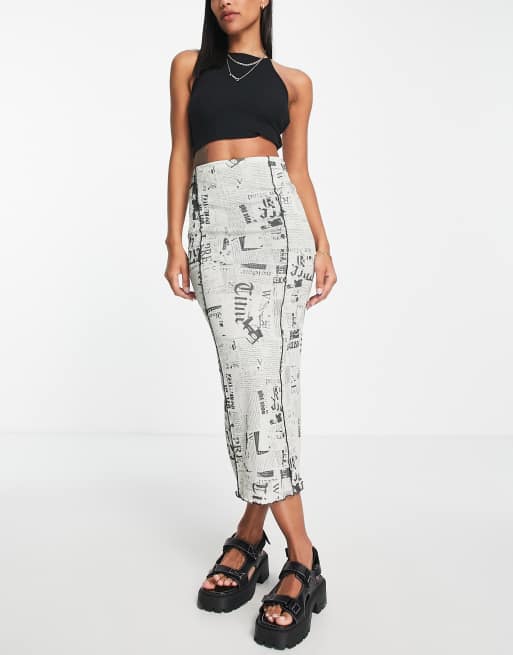 Topshop grunge newspaper print midi skirt in black and white