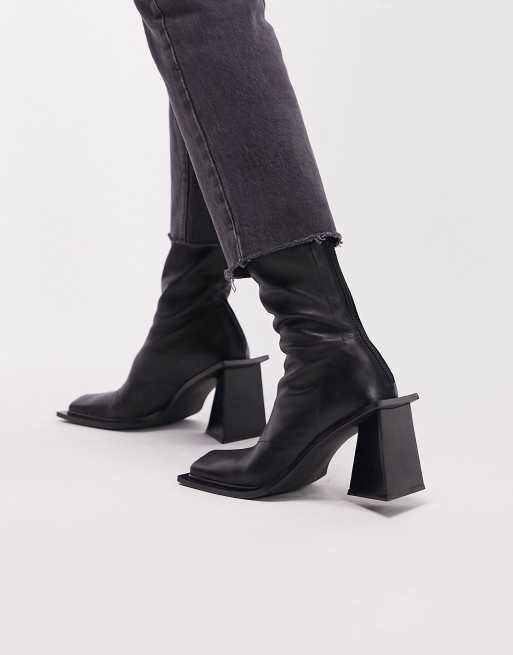 Topshop Halo premium leather square toe heeled boot in black
